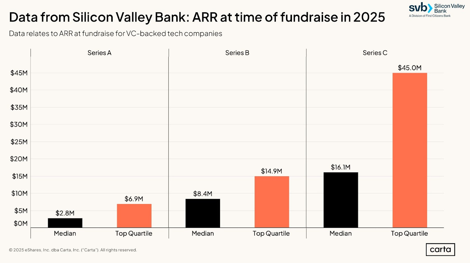 According to Carta data, the median company raising a Series A in the US is around $2.8M in ARR (roughly €2.4M). That said, the acceptable range is wider in practice, specially for non-US companies. As Christoph Janz, Partner at Point9 Capital, points out, many SaaS companies raise Series A between $1M and $2.5M in ARR, even less in some cases if the company is in a strong market or showing exceptional growth.