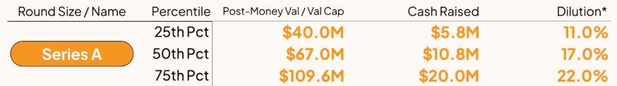 According to Carta’s data, Series A rounds typically land in the $5M–$15M range, with pre-money valuations often between $20M and $60M. These are not hard rules. Hot sectors, especially AI, and teams with exceptional traction can push well beyond these ranges, while companies in colder markets usually need stronger proof to reach similar outcomes.